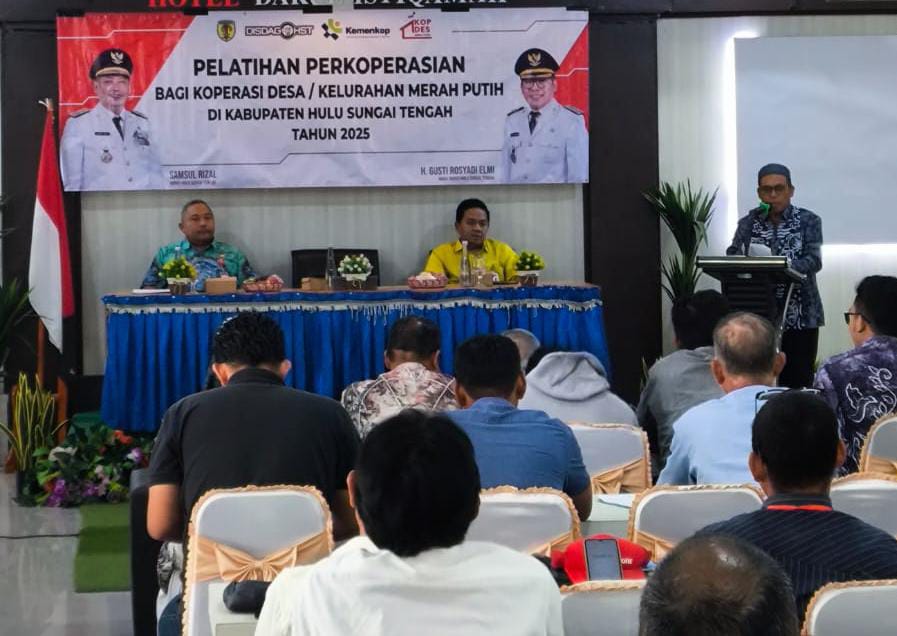 baritorayapost.com,Barabai – Dinas Perdagangan (Disdag) Kabupaten Hulu Sungai Tengah (HST) membekali para pengurus Koperasi Desa (Kopdes)/Kelurahan Merah Putih pelatihan perkoperasian di Aula Hotel Darul Istiqamah Barabai, Kamis (25/9/2025).