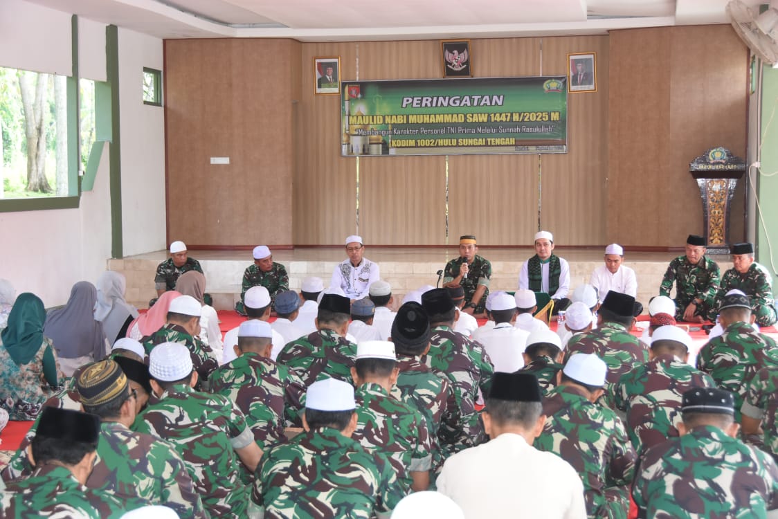 Baritorayapost.com,BARABAI – Kodim 1002/Hulu Sungai Tengah (HST) menggelar Peringatan Maulid Nabi Muhammad SAW 1447 H/2025 M dengan tema “Membangun Karakter Personil TNI Prima Melalui Sunah Rasulullah”, bertempat di Aula Sapta Marga, Jalan Telaga Padawangan, Barabai Timur, Kamis (11/9/2025).