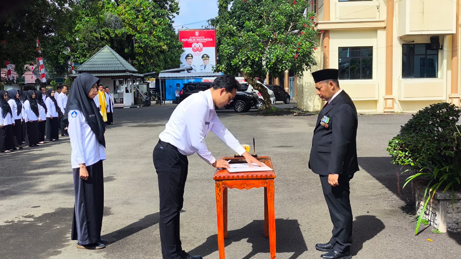Prosesi pelantikan sekaligus penandatanganan Surat Keputusan (SK) pengangkatan pertama kali PPPK jabatan fungsional dan jabatan fungsional PNS berlangsung di Halaman Kantor Bupati HST, Senin (25/8/2025).