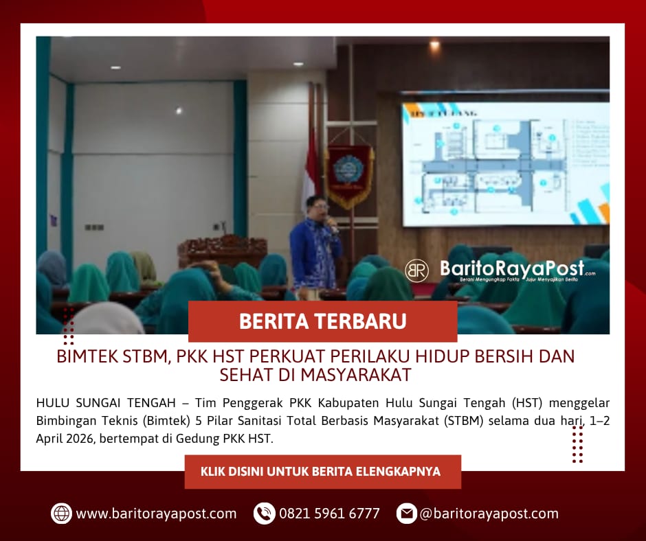 Baritorayapost.com,HULU SUNGAI TENGAH – Tim Penggerak PKK Kabupaten Hulu Sungai Tengah (HST) menggelar Bimbingan Teknis (Bimtek) 5 Pilar Sanitasi Total Berbasis Masyarakat (STBM) selama dua hari, 1–2 April 2026, bertempat di Gedung PKK HST.
