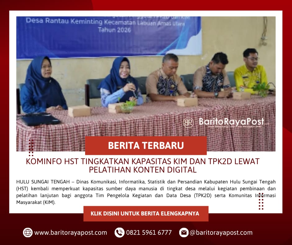 Baritorayapost.com,HULU SUNGAI TENGAH – Dinas Komunikasi, Informatika, Statistik dan Persandian Kabupaten Hulu Sungai Tengah (HST) kembali memperkuat kapasitas sumber daya manusia di tingkat desa melalui kegiatan pembinaan dan pelatihan lanjutan bagi anggota Tim Pengelola Kegiatan dan Data Desa (TPK2D) serta Komunitas Informasi Masyarakat (KIM).