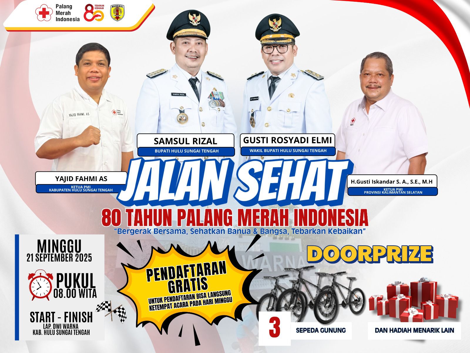 PMI HST mengajak seluruh warga Hulu Sungai Tengah untuk hadir dan memeriahkan kegiatan ini. “Mari kita bergerak bersama, menebar kebaikan, dan menjadikan momen HUT ke-80 PMI sebagai pengingat pentingnya solidaritas dan kepedulian sosial,” tambahnya.